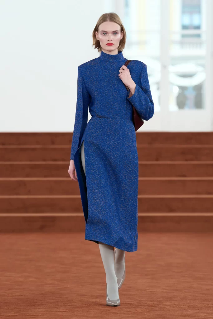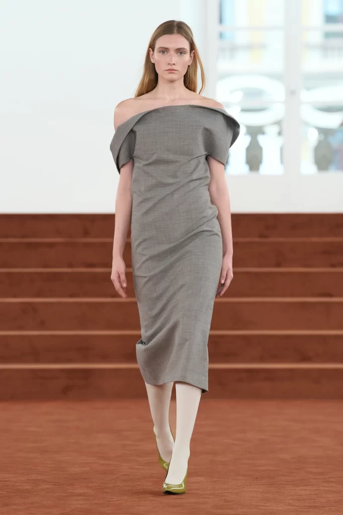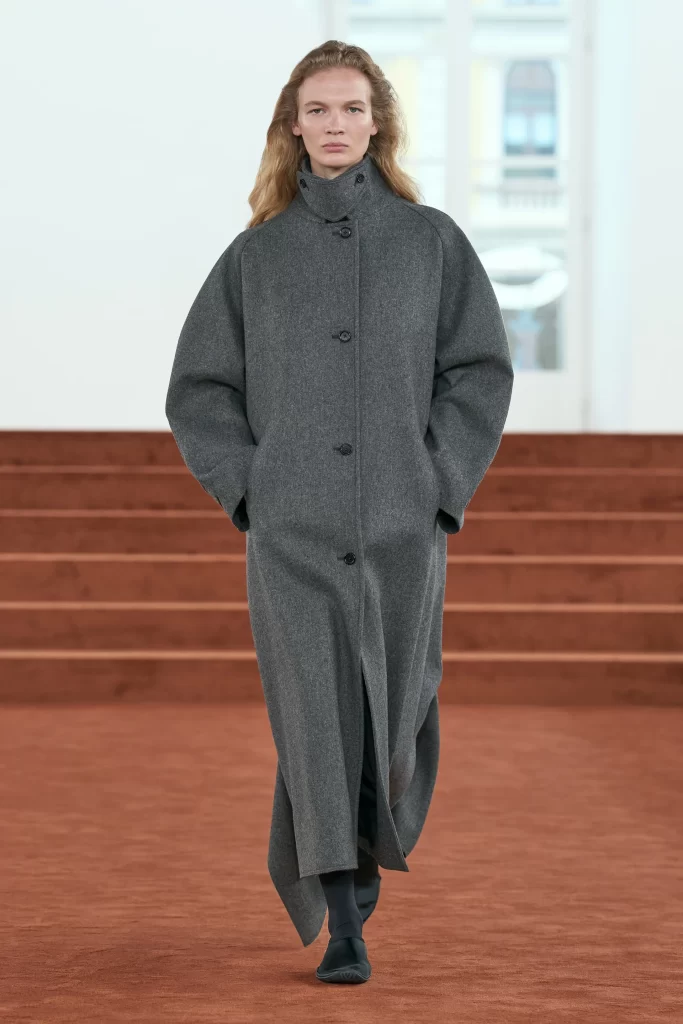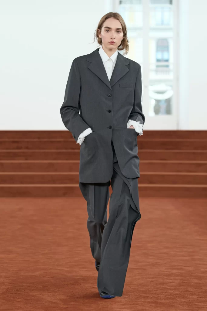 Accessories remain understated, almost secondary, reinforcing the collection’s focus on silhouette over embellishment. Footwear is minimal and grounded, often blending seamlessly into the look, while the occasional muted bag introduces just enough contrast to disrupt the uniformity. Nothing competes—everything supports.