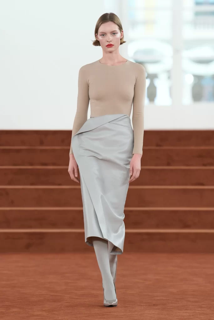 Fluidity replaces rigidity, with a barely-there top and a wrapped satin skirt that moves with a sense of controlled ease