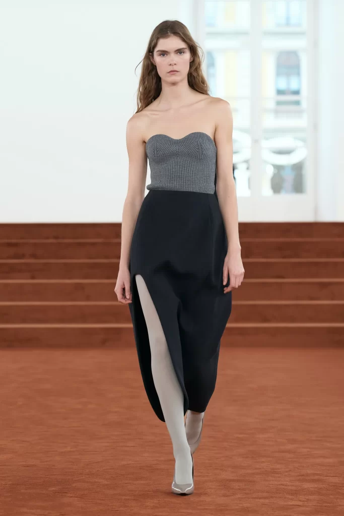 A study in contrast—soft ribbed structure against a sharply cut skirt—introducing the collection’s quiet tension from the outset
