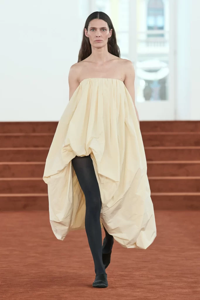 Volume appears, but without drama—gathered fabric that feels more intimate than theatrical, suggesting movement within stillness