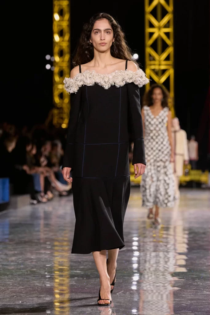 A striking contrast in movement and color, where fluid pleating meets sculptural jewelry in one of the collection’s most visually commanding silhouettes