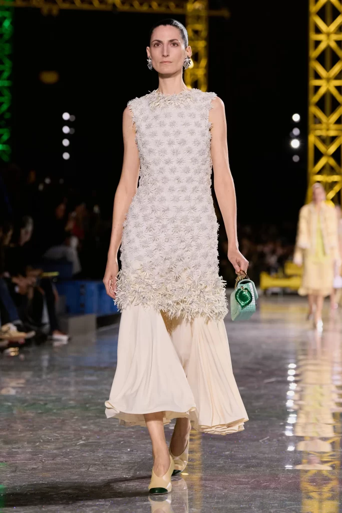 Lightness and texture define this look, with movement built into every step through its soft, layered construction