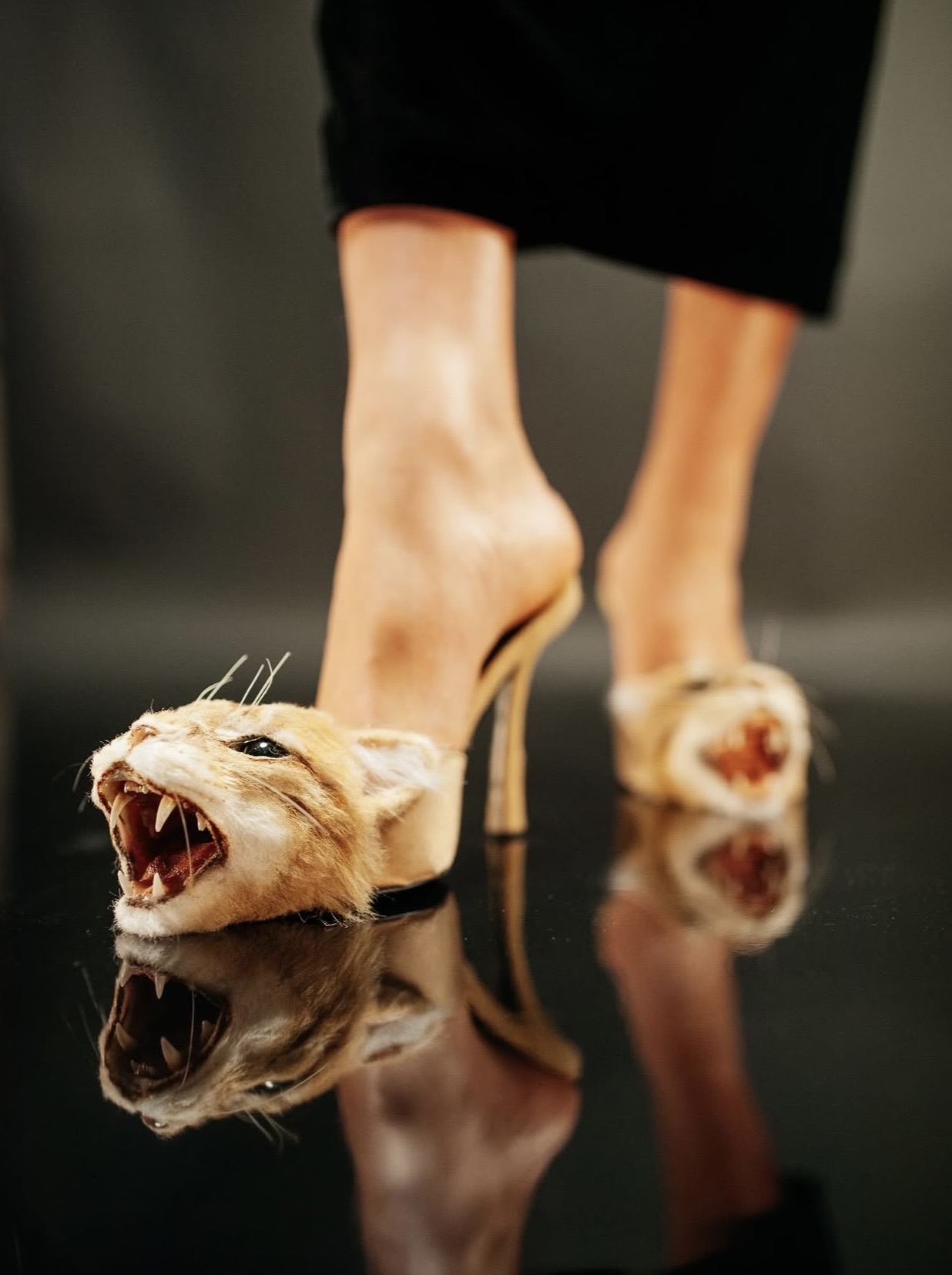 The house’s theatrical heritage continues through sculptural animal-inspired footwear