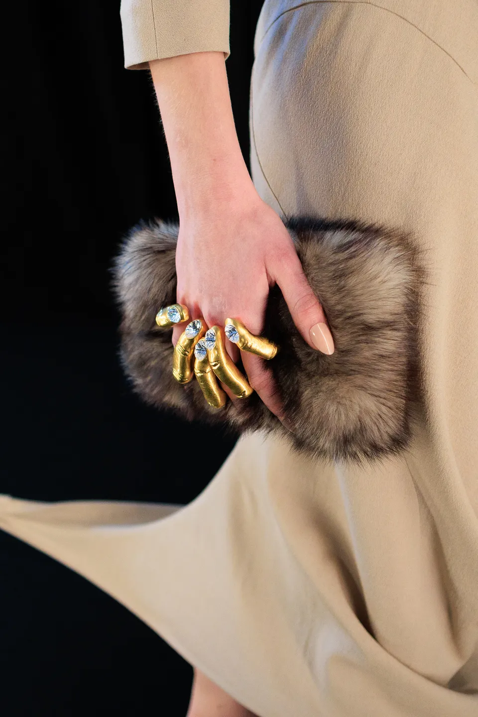 Gilded animal motifs appear throughout the accessories, echoing the house’s playful surreal symbolism