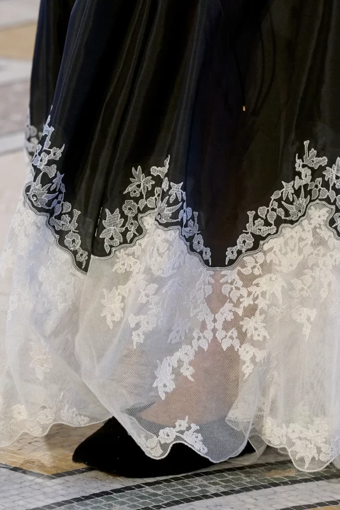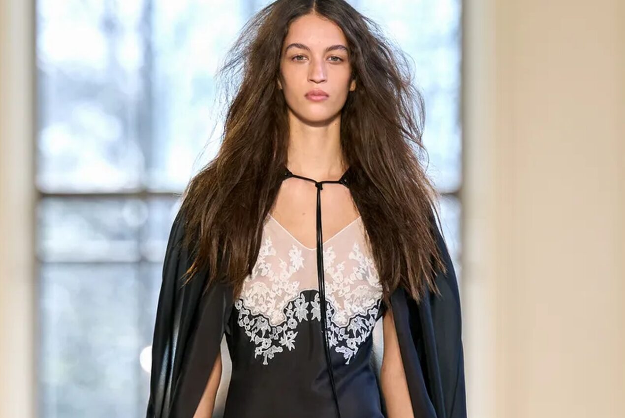 Delicate ivory lace embroidery traced the hem of flowing black skirts, highlighting Gabriela Hearst’s focus on artisanal craftsmanship.
