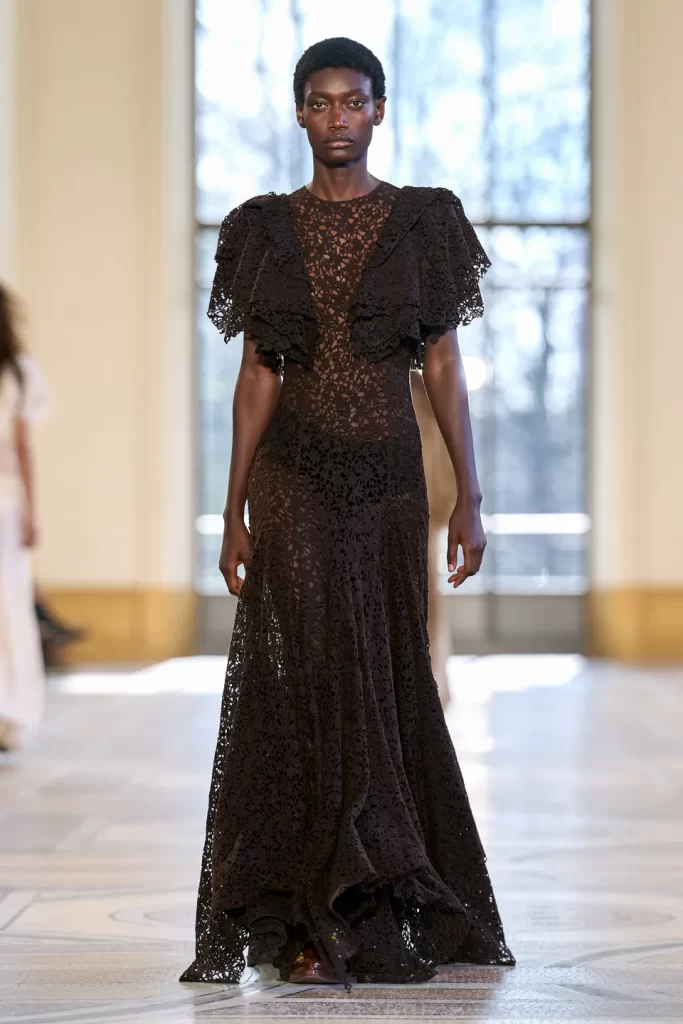 Neutral palettes dominated the runway, with deep browns, ivory, and black layered in sophisticated compositions that highlighted Hearst’s dedication to refined simplicity. Oversized coats, tailored trousers, and delicate lace details were balanced with soft draping and modern evening silhouettes, creating a collection that felt both powerful and effortlessly wearable.
