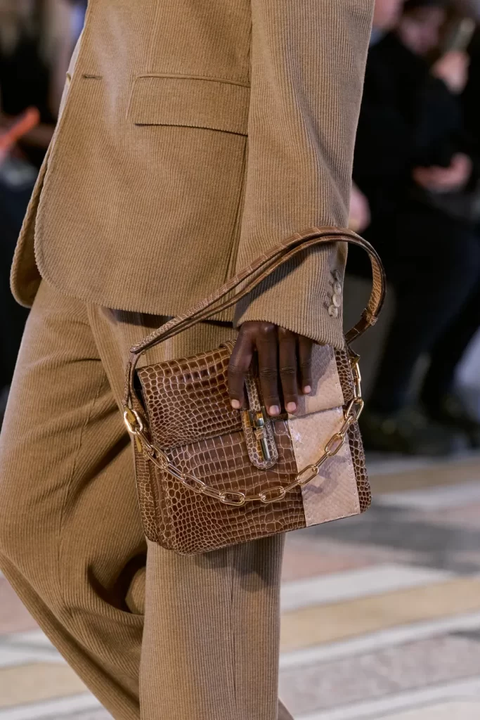 Structured crocodile handbags finished with oversized gold chains introduced a touch of modern luxury to the tailored looks.