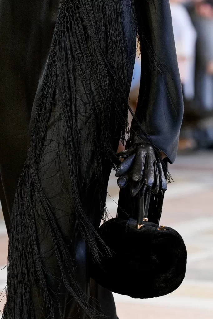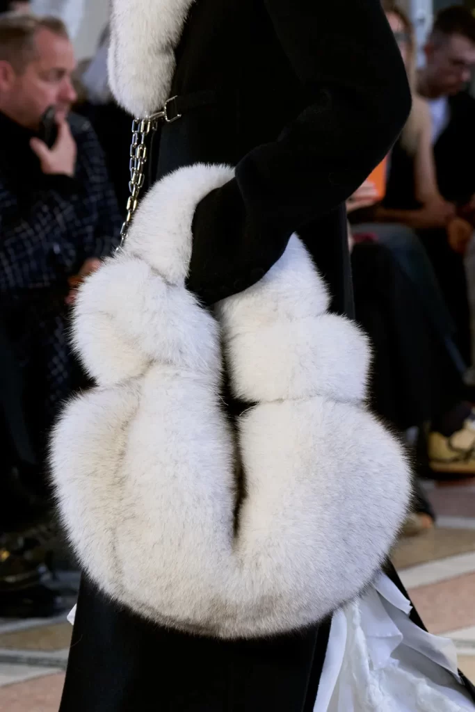 Sculptural fur muffs appeared as statement accessories, combining warmth and elegance in a refined winter silhouette.