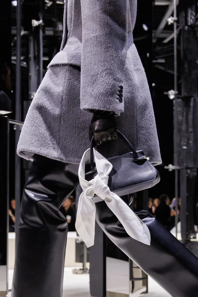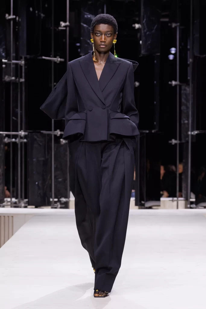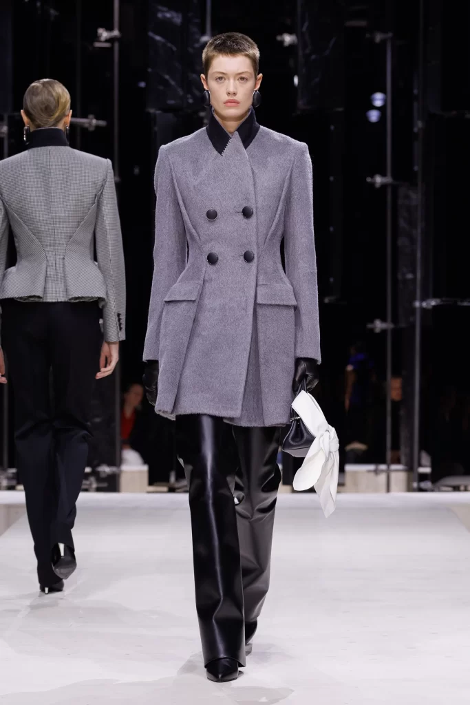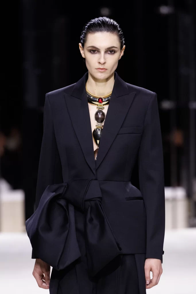 Sculptural tailoring takes center stage as a sharply defined silhouette is softened by a dramatic bow detail, introducing volume and movement while maintaining a sense of controlled elegance.