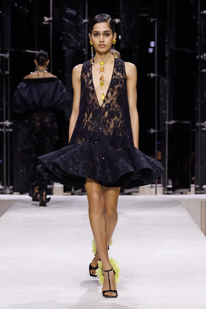 Delicate lace introduces a sense of lightness and femininity, with volume and transparency creating a dynamic interplay between softness and structure.