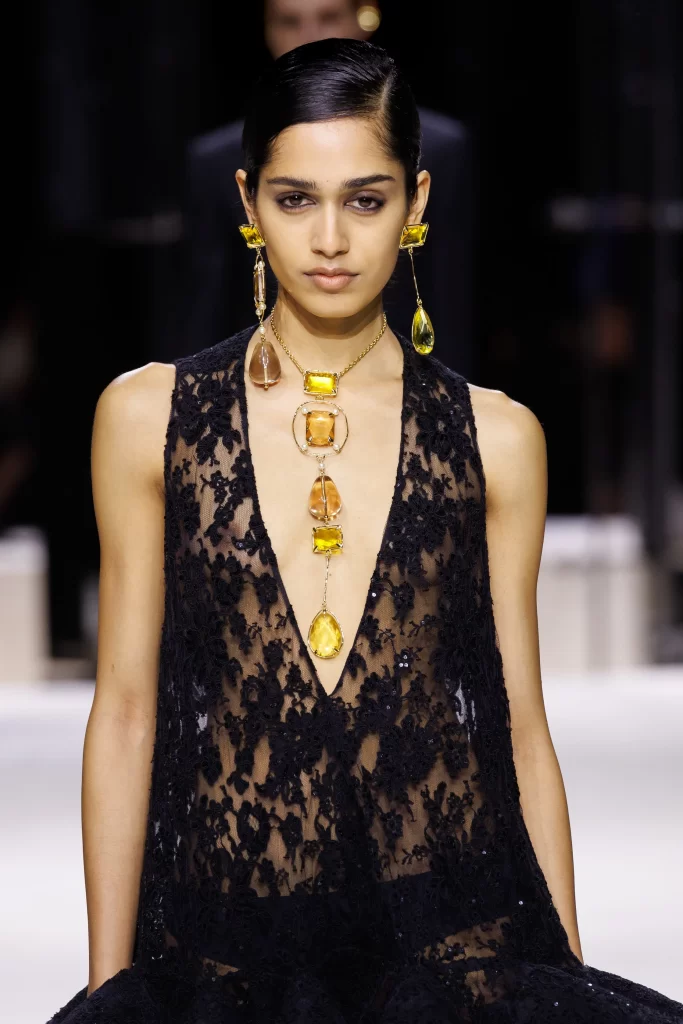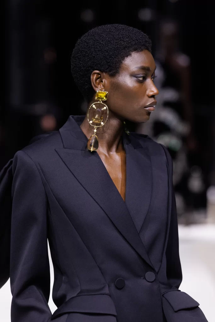 Structured tailoring is punctuated with sculptural jewelry, where oversized stones introduce a bold, almost ceremonial presence.