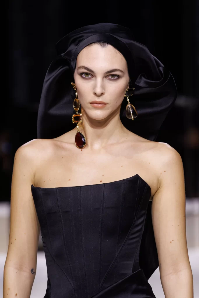 Sculptural headwear by milliner Stephen Jones emerges as a defining element, extending the silhouette and introducing a bold, architectural dimension to the collection.