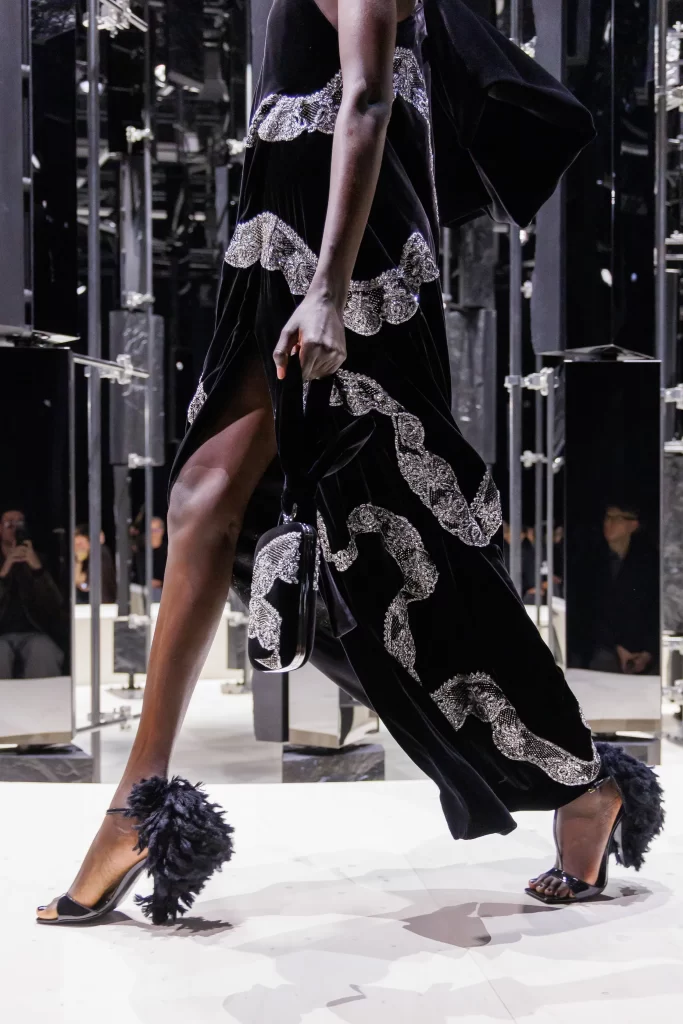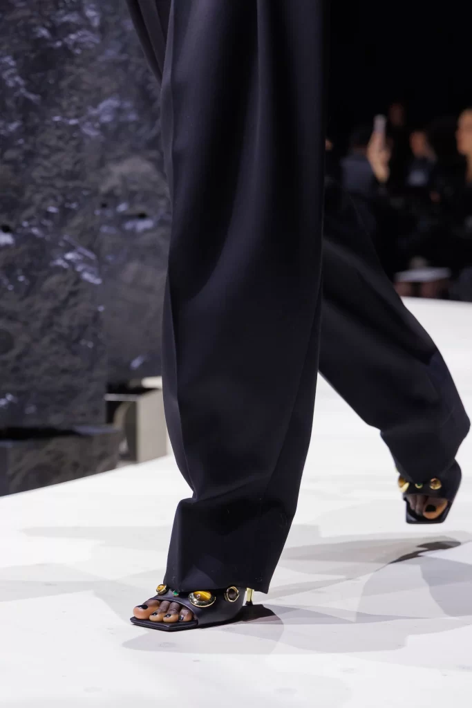 Textural contrasts continue through footwear, where sculptural heels introduce subtle drama and dimension.