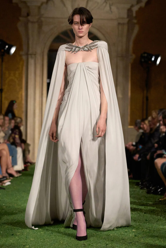 Under the direction of Alessandro Michele, Valentino Fall Winter 2026 unfolds as a study in controlled drama, where fluid draping meets sculptural precision. Silhouettes move between softness and structure— delicate sheer layers and lace contrasted by strong shoulders and elongated lines — creating a tension that feels both romantic and commanding. Rich tones of crimson, […]